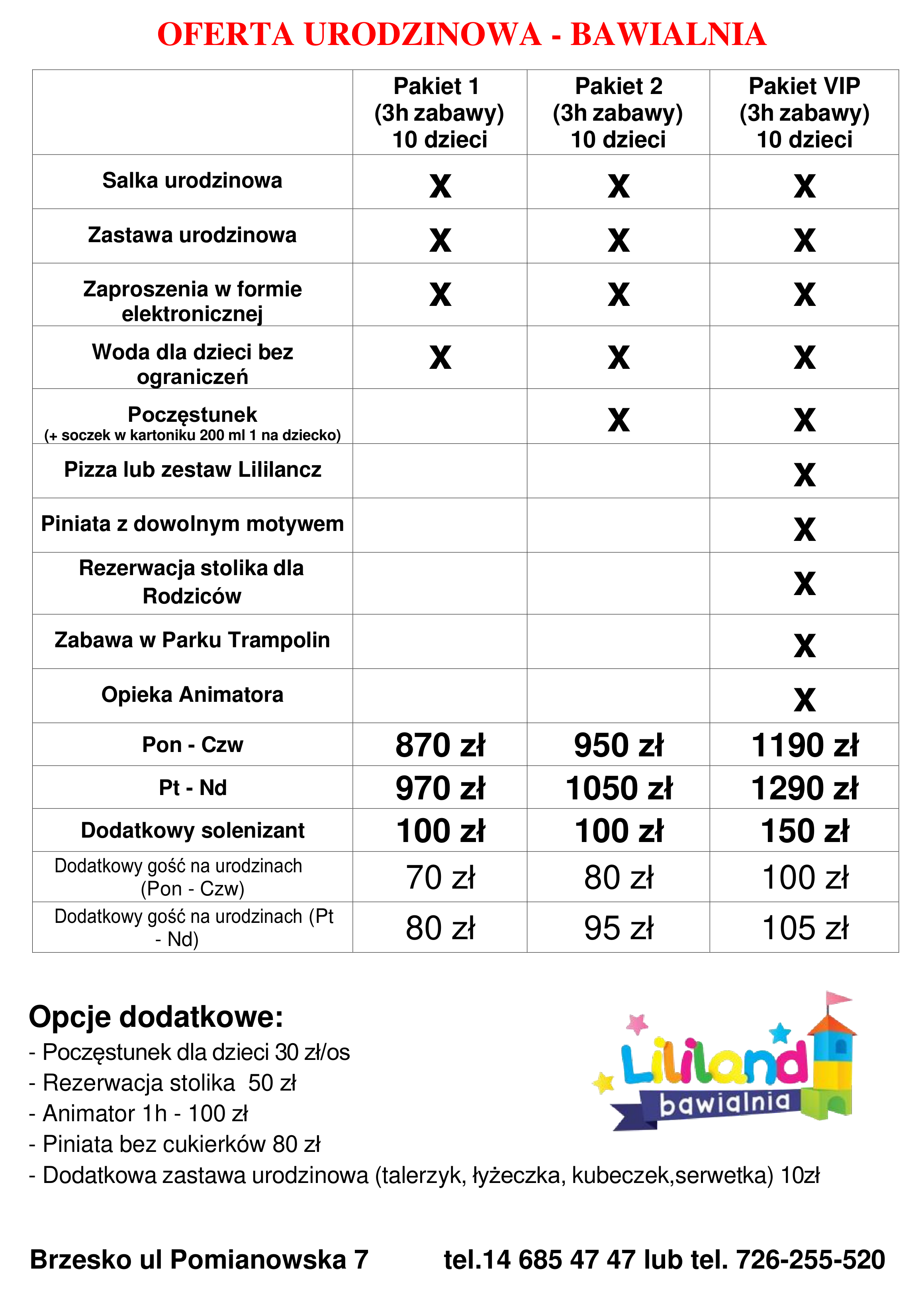 Czas wynajmu pokoju urodzinowego oraz pobytu w Bawialni Lililand wynosi 3h, wprzypadku Parku Trampolin 2h (czas liczony jest od ustalonej godziny, a nie odmomentu zebrania się gości).